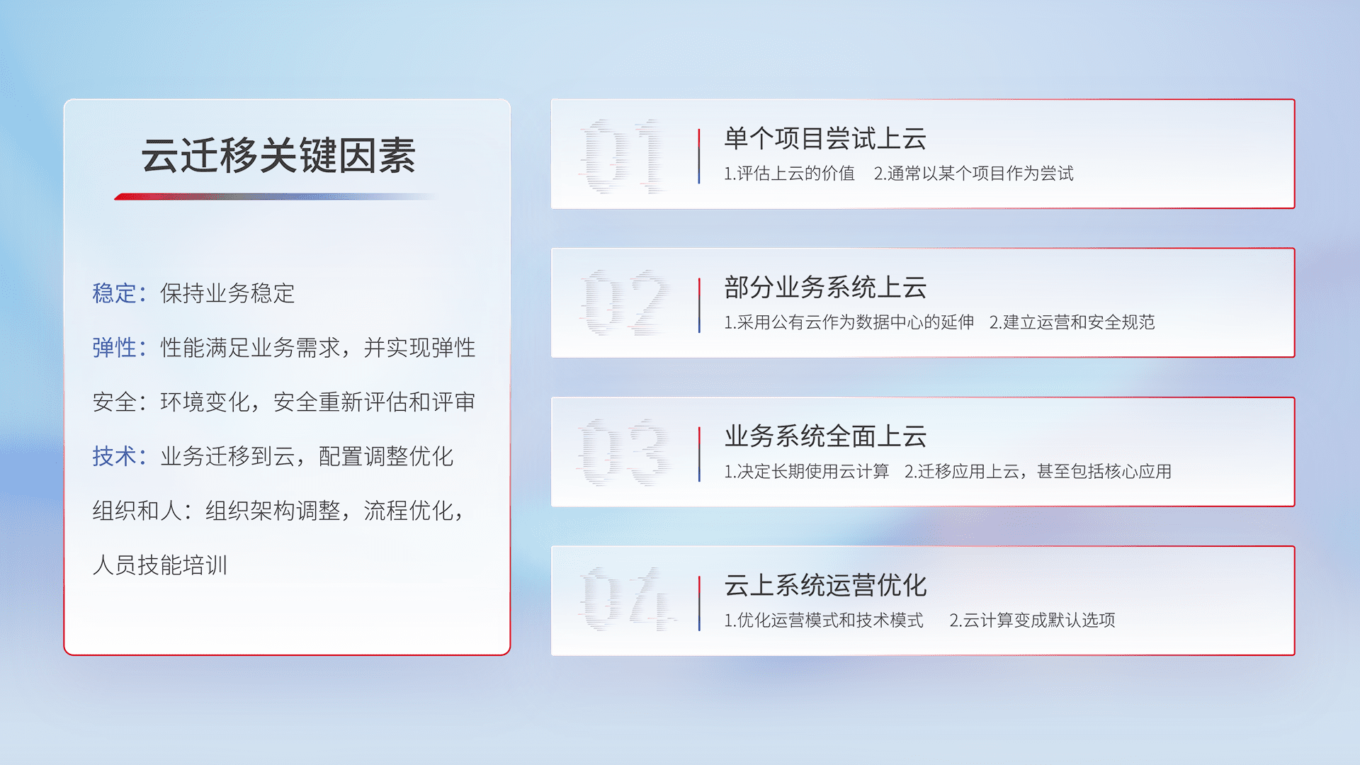 结合实际业务,,,从规划设计、、、、云平台选型、、云原生改造、、、、数据迁移、、、、集成交付,,,迁移全过程为客户识别最佳上云路径,,,,做好风险识别管理,,,,设计网络架构、、、身份权限、、、、安全审计合规、、操作审计、、、日志审计、、监控告警策略、、、多站点容灾设计等,,,对云上基础设施进行整体规划,,,提升IT治理水平,,,以满足弹性、、高可用、、高性能的需求。。。。
